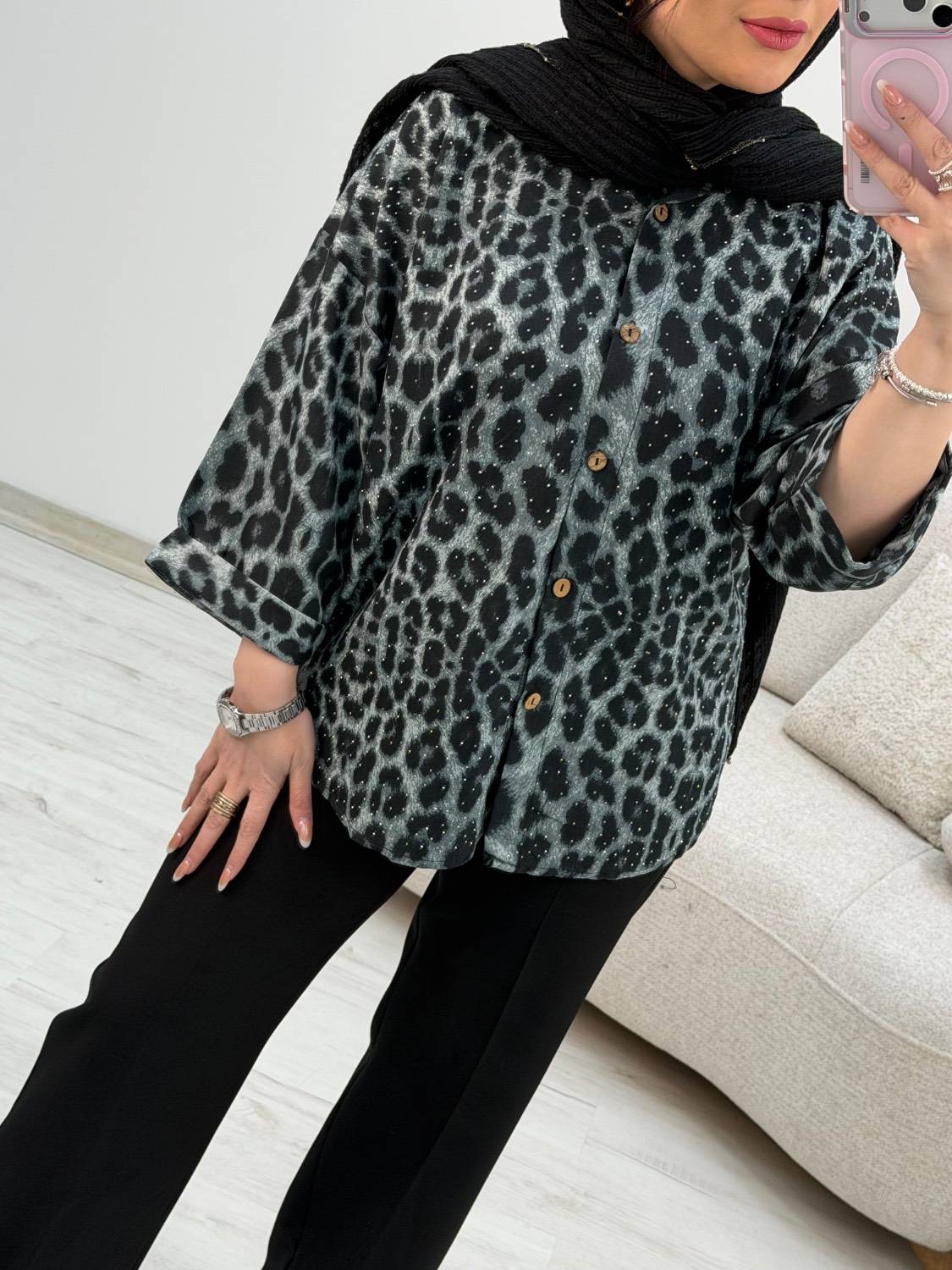 نام : شومیز پلنگی نگین دار جنس : بوگاتی رنگ بندی : طوسی, نسکافهای, قهوهای سایز ها : فری۳۸تا۴۶ قدشومیزحدودا۷۰ قداستین از یقه ۵۴ دوربازو۴۸ دورسینه ۱۲۲