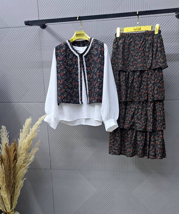 📋 توضیحات: ست شومیز جلیقه و دامن یعنی شیکپوشی با راحتی ترکیب میشه! 💖